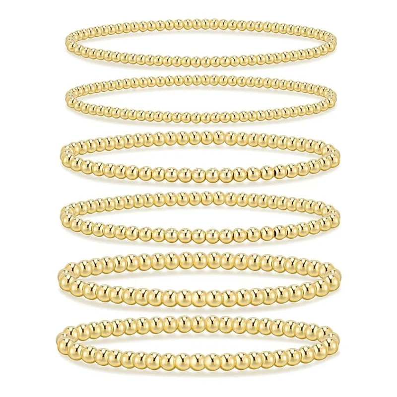 Rozciągliwa złota bransoletka dla pań: Długość: Każda bransoletka z koralików powlekanych 14-karatowym złotem ma długość 7,25 cala. Rozciągliwa, pozłacana bransoletka ze sznurka koralikowego jest elastyczna i nadaje się do noszenia na różnych nadgarstkach, dzięki czemu zawsze emanuje elegancją i seksapilem.