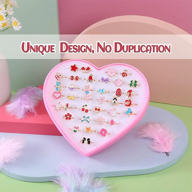 Wewnątrz pudełka znajduje się 36 pierścionków ze stopu biżuterii dla dziewczynek. Wszystkie te pierścionki są kolorowe i urocze, mają wzory takie jak białe króliki, truskawki, kwiaty, sowy, gwiazdki, żółwie, kotki, kokardki, jabłka, wiśnie, motyle, grzyby, jednorożce, koniczyna itp. To doskonały prezent dla ukochanej księżniczki.