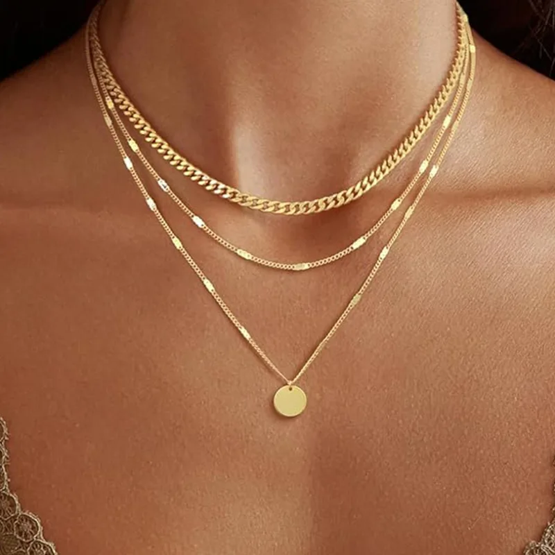Pozłacany naszyjnik damski dla kobiet zawiera trzy różne wzory naszyjników, a mianowicie łańcuszek kubański, łańcuszek spiczasty i łańcuszek z monetami, które można nosić osobno lub ułożone w stos. Krótki 13,8-calowy kubański łańcuszek (5 mm szerokości) jest retro i wykwintny, średni 15-calowy spiczasty łańcuszek jest prosty i schludny, a długi 17-calowy łańcuszek na monety jest wszechstronny i elegancki. Te trzy style uzupełniają się, tworząc silne wrażenie nakładania się na siebie, a każdy z nich ma swój własny urok, gdy jest noszony osobno.