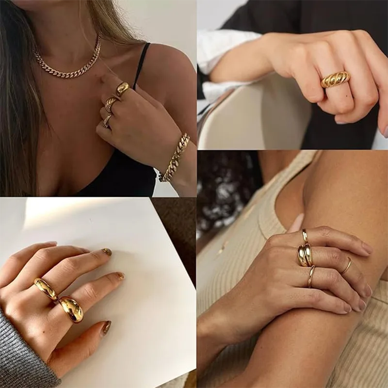 Zestaw złotych pierścionków. Te damskie pierścionki pokryte prawdziwym złotem są dostępne w różnych stylach, w tym w kształcie serca, w kształcie pieczęci, w kształcie kwadratu, rurowy, gruby i skręcony. Jest ich mnóstwo, aby spełnić Twoje różne potrzeby związane z ubieraniem się i stworzyć dla Ciebie najlepszy wygląd!
